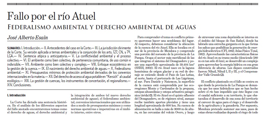 En este comentario publicado por la revista La Ley, se consideran aspecto de la sentencia de la Corte en relación al manejo ecosistémico de cuencas.… Leer más »Nota al fallo «La Pampa c Mendoza», en el conflicto por el río Atuel.
